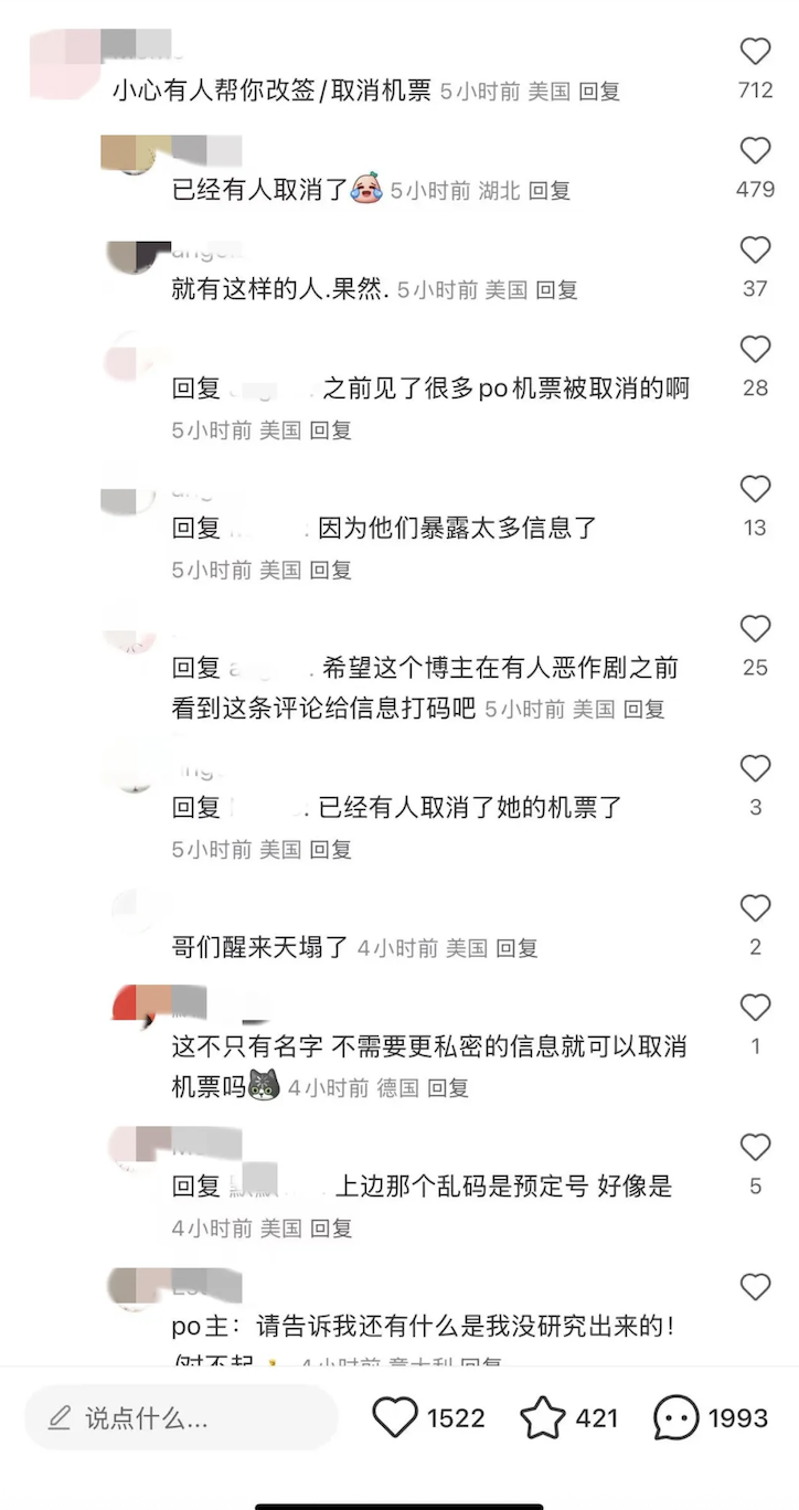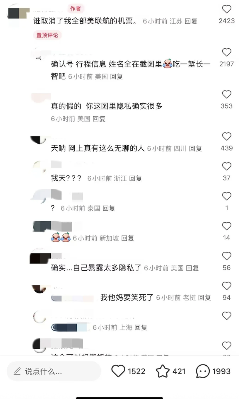 前阵子我们报道过一位留学生在朋友圈晒回国机票,结果机票被人暗中取消。没想到类似的事又发生了:这次是一位准备国庆赴美旅游的中国网友,在“小红书”发了自己三段联程机票的截图——包含姓名、订单号和PNR(订位编码)等关键信息。