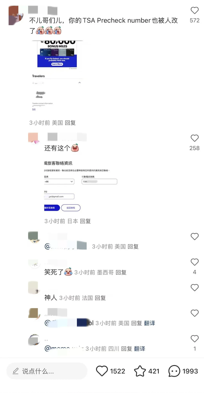 有人在评论里善意提醒“别把这些发出来”,可惜为时已晚:他回头发现,竟然全部航段被取消了,连他的TSA Pre-Check(美国机场快速安检)资料也被篡改了。