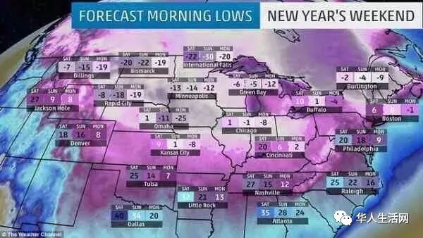 整个美国2.2亿人口,除了南部和西南部省份,其它地区都在接近零度甚至低于零度的气温中。