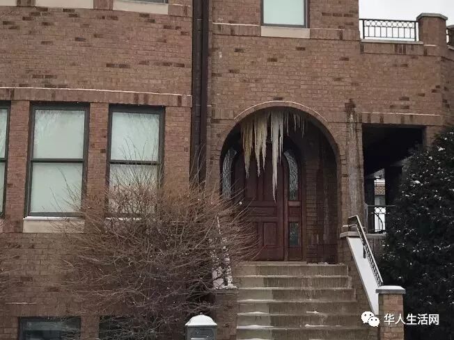 低温侵袭下,芝加哥地区水管爆裂的情况不断,一处位于桥港区的独栋住宅,房屋内暖气疑因屋主全家出游而仅保持在55度左右,造成外墙水管爆裂,漏出的大量用水,不仅使房屋入口处结冰打滑,门前更形成“冰柱墙”奇观。