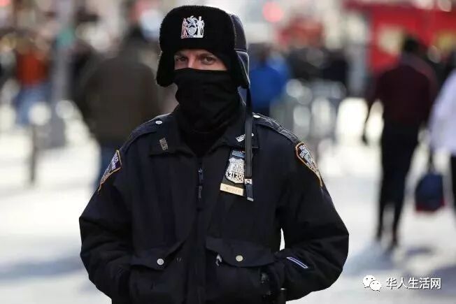 纽约时报广场上跨年夜,一名警察全身包紧紧御寒。