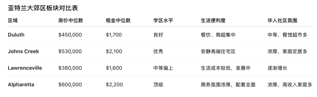 很多华人家庭选择在北部郊区(Duluth、Johns Creek、Alpharetta等地)定居,这些区域集中了优质学校、相对安全的社区和便利的生活设施。