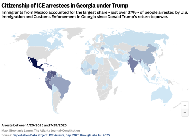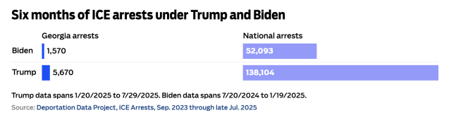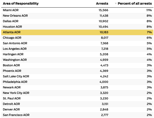 从数字上看,2025年前六个月,佐治亚州共有 5,670人 被ICE逮捕,而拜登任期最后六个月仅为 1,570人。而亚特兰大ICE办公室(负责佐治亚、南卡、北卡三州)在全美排在第五,仅次于迈阿密、新奥尔良、达拉斯和休斯顿。