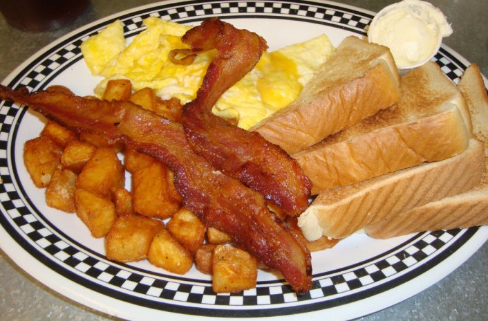 这道菜是美国最常见的早餐,就是把两颗鸡蛋,烤马铃薯,两片吐司面包,以及培根/火腿/香肠凑成一盘。只要是美国的早餐店都绝对会提供这道菜,有时候会变些花样,比如说改成三颗鸡蛋,面包改成松饼,等等。