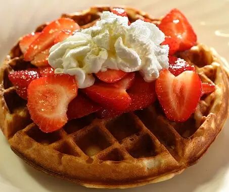 早上想吃甜点的同学,Pancake,French Toast,和Waffle绝对是首选。这三道面食本身是咸的,甜味由配料来提供。最经典的配料是Maple Syrup (枫树糖浆)和Butter,其他常见的有巧克力酱、Nutella (巧克力榛子酱)、焦糖、花生酱、肉桂、鲜奶油、冰淇淋、等等。水果和坚果也是常见的搭配,如香蕉、草莓、蓝莓、Raspberry (桑莓)、Kiwi (奇异果)、椰子果肉,和Walnut (胡桃)、Pecan (薄壳胡桃)、烤花生,等等。Pecan有的时候会绞碎混进Pancake里,而蓝莓草莓可能会先泡过糖浆。最普遍的组合应该是香蕉配Pecan,蓝莓草莓配鲜奶油,烤花生配焦糖,还有巧克力酱配冰淇淋。
