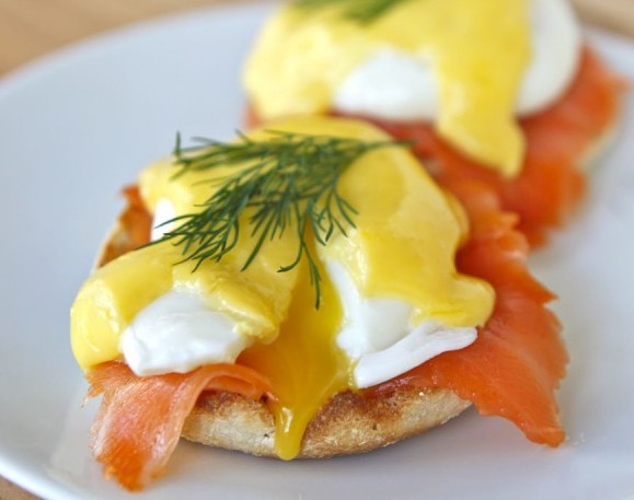 传统的Eggs Benedict特指两片吐司,各放一片火腿和一颗荷包蛋,然后淋上黄色的Hollandaise酱。Hollandaise酱是个又浓又酸又甜的酱,成份是蛋黄、Butter、醋、和柠檬