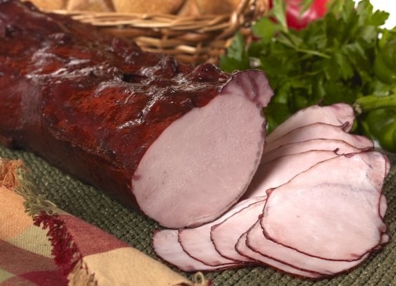 接下来服务生会问你想要培根,火腿,还是香肠。培根要Crispy (脆)还是Chewy (有咬劲),香肠要牛肉的、猪肉的、火鸡肉的、还是鸡肉的,火腿要普通的还是Canadian (肉瘦有咬劲,下图)。香肠通称Sausage,有的时候是一根一根的 (Sausage Links),有的时候是一坨一坨的 (Sausage Patty)。顺带一提,Canadian Ham就是Canadian Bacon。