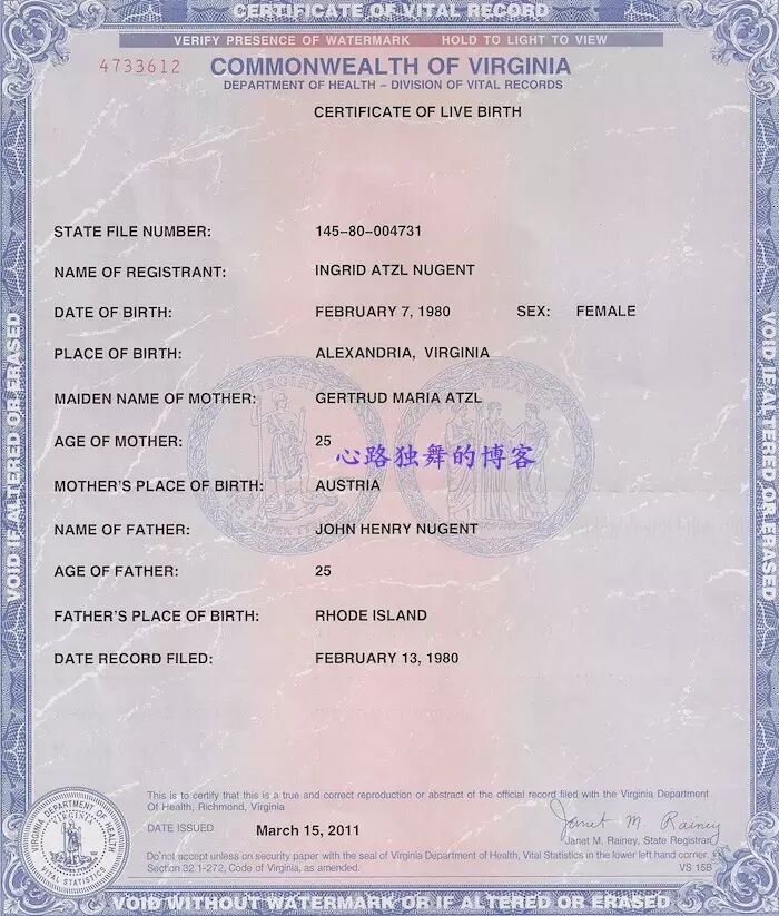 那么美国户口好办吗?事实是美国没有户口,美国人一生大约只需要三个证件。一是出生证明,上面列出了你在哪里出生,父母是谁,父母的年龄和在哪里出生。这个证明很重要,父母都会给孩子好好保存,因为在孩子成年之要前上学或办护照等凭得就是这个证件,它能证明“你妈是你妈”、“你爸是你爸”、“你孩子是你孩子”和“你是美国人”等。这个证明办起来很简单,父母把孩子出生医院给的出生记录加上填好的申请表一起寄到所在州的健康服务部门就行,现在甚至还可以网上申请了,费用也不高,原件一旦丢失了的话父母或本人可以凭驾照或护照等有照片的证件申请重发,只是重发的出生证明底下会有签字盖章证明这是原件的复制件(certified copy)。这是弗吉尼亚出生证明的典型样子。