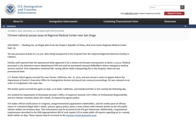 一名中国公民谢华兵(Huabing Xie,音译)在美移民拘留所突发疾病身亡。这已是特朗普执政以来,ICE拘留设施内第15起死亡事件,引发对移民拘留条件和医疗保障的广泛质疑。