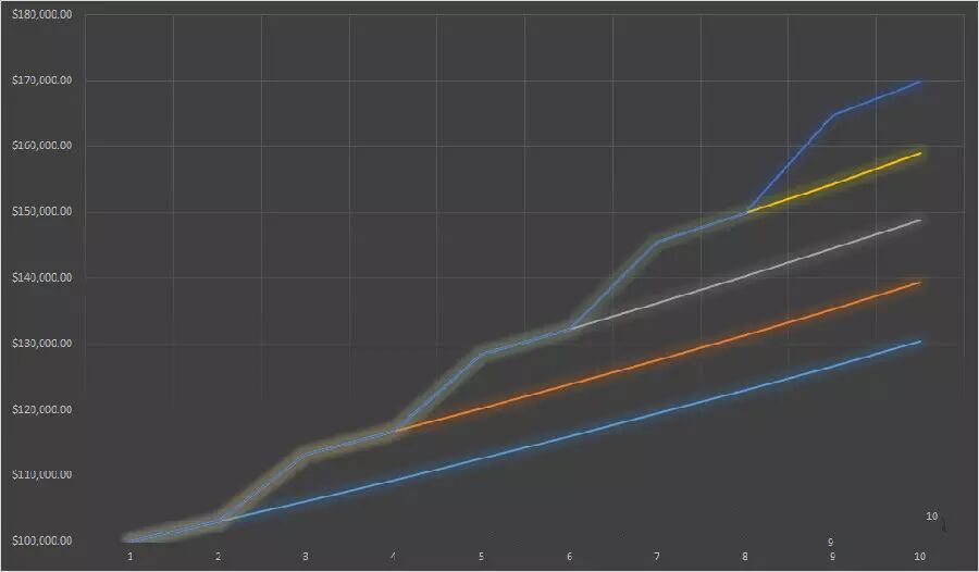 在美国,假设一个人的职涯持续十年,他每年平均加薪 3%,换工作的待遇则平均加薪 10%。