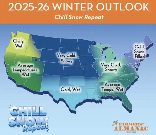 根据年鉴预测,2025-2026 年的冬季,美国的寒潮将主要集中在北部地区,从北部平原到新英格兰都将经历最冷的温度。而东南部,包括佐治亚州,则被归为“平均偏冷+潮湿”的区间。