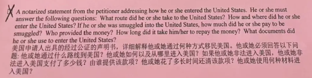 根据该网友展示的图片显示,补件的信息为:“美国申请人出具的经过公证的声明书,详细解释他或她通过何种方式移民美国。他或她必须回答以下问题:他或她通过什么路线到美国?他或她如何以及从哪里进入美国?如果他或她非法进入美国,他或她非法进入美国支付了多少钱?由谁提供该款项?他或她花了多长时间还清该款项?他或她使用何种材料进入美国?”
