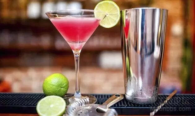 柯梦波丹(Cosmopolitan/Cosmo): 伏特加、橙皮酒、蔓越莓汁加莱姆汁,调制出的粉色鸡尾酒。