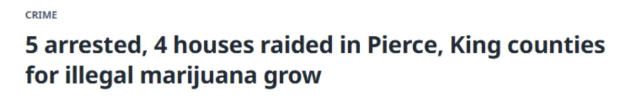 华盛顿州警方日前破获一起非法大麻种植案,案件涉及皮尔斯县(Pierce County)与金县(King County)多处住宅,5人被捕,现场查获数百株大麻植物、种植设备及至少3.8万美元现金。