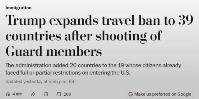 路透社指出,此次扩大入境限制的决定,也发生在美国近期一系列安全事件背景之下。上月,华盛顿发生枪击事件,造成两名美国国民警卫队成员及一名平民遇害。调查人员表示,嫌疑人为一名通过难民安置计划于2021年进入美国的阿富汗籍人士。事件发生后,特朗普政府再度强调加强入境审查和移民执法的必要性。