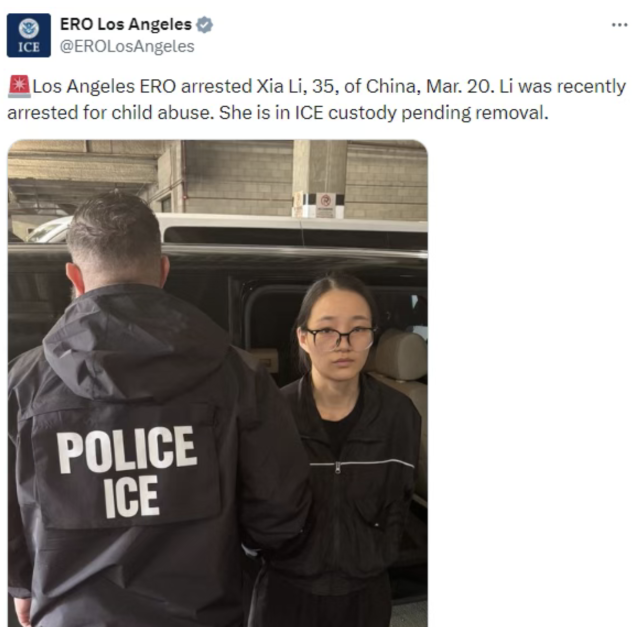 美国移民暨海关执法局(ICE)洛杉矶分局近日在社交平台X发布通报称,执法人员已于3月20日在洛杉矶地区逮捕一名35岁的中国籍女子李霞(Xia Li,音译)。