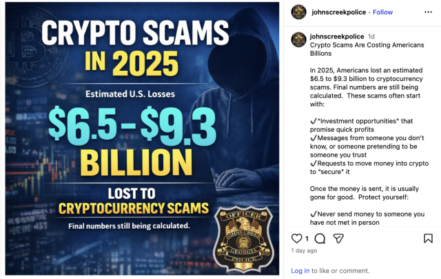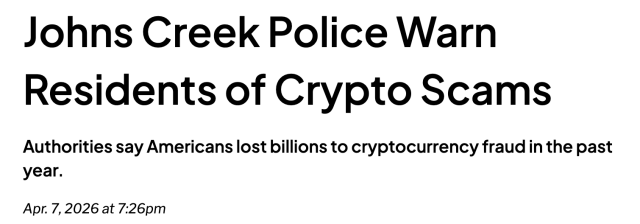 2026年4月7日,Johns Creek警方再次向居民发出警告:加密货币诈骗正成为本地乃至全美最严重的金融犯罪之一。