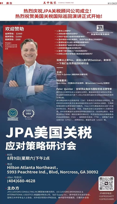 2025年8月9日(星期六)下午2点至4点,“JPA美国关税世界巡回研讨会” 首站活动在亚特兰大Hilton Atlanta Northeast酒店隆重举行(地址:5993 Peachtree Ind. Blvd, Norcross, GA 30092)。