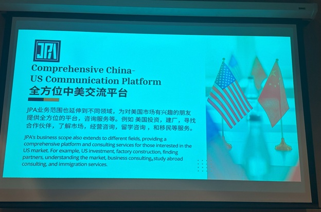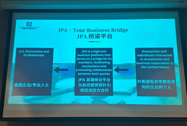 JPA业务范围广泛,涵盖美国投资、建厂、合作伙伴对接、市场了解、经营咨询、留学及移民等领域,为有意进军美国市场的企业与个人搭建全方位的交流与合作平台。JPA——Your Business Bridge。
