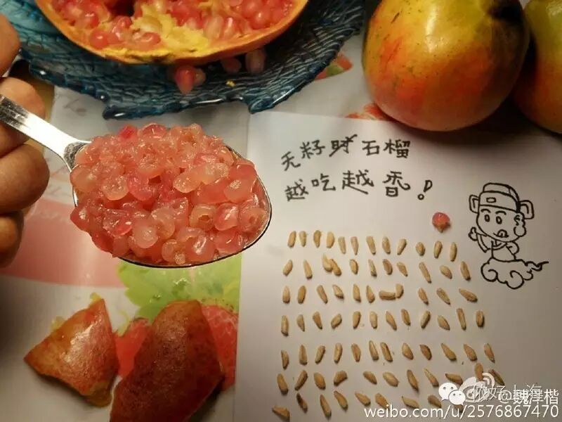 能夠把石榴一粒一粒剝下來已是本事,這哥們居然連石榴籽也挖出來了。圓了多少人「無籽石榴」的夢想啊!一大勺塞進嘴裡,任石榴汁充滿口腔,想想都爽翻天了。