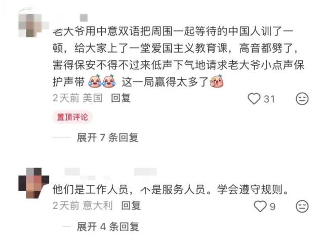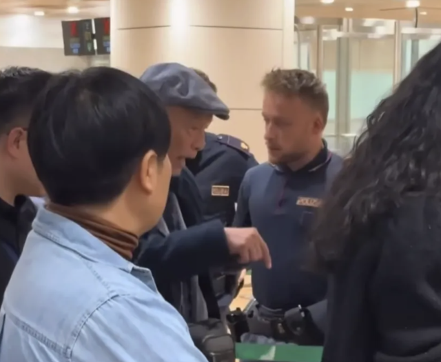 視頻顯示,兩名義大利邊防警員上前溝通,大爺用簡單的義大利語回應他們,但情緒依舊激動。