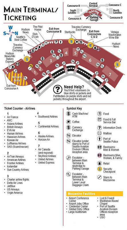 乘坐不同航空公司的飛機會在不同的機場終端(這裡叫做 concourse)登陸。你們可以看到有標誌Concourse A淺綠色 /B橙黃色 / C深綠色 /D土黃色的4個終端,比如乘坐的中國海南航空公司到達西雅圖的終端是左邊那塊單獨的藍紫色方塊south satellite(南衛星樓)