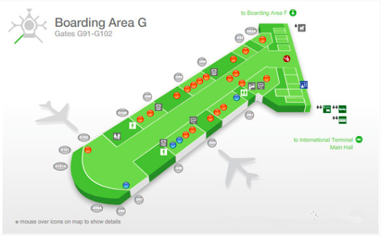 我們以G91-G102為例,下了飛機之後,你只有往前走,可以跟著人流走,即可,如果趕時間的話,推薦沖在人群前面,先去排隊。走到盡頭就能看見入境辦理手續了,如下圖的最右側紅點。