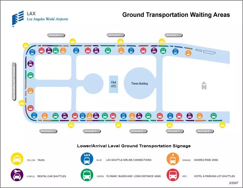 如果你乘坐的航班需要轉換航站樓,請注意看下面的Ground Transportation waiting areas示意圖。在LAX轉機簡直就像噩夢一樣,比如你乘坐國航抵達LAX,轉乘UA前往其他城市時,如靠走路,至少要走上40分鐘!