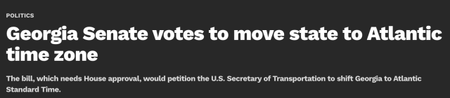 2026年3月24日,喬治亞州參議院以45比5的壓倒性票數通過了HB 154法案,正式向美國交通部長請願:把佐州從東部時間(Eastern Time)永久切換到大西洋時間(Atlantic Standard Time)。