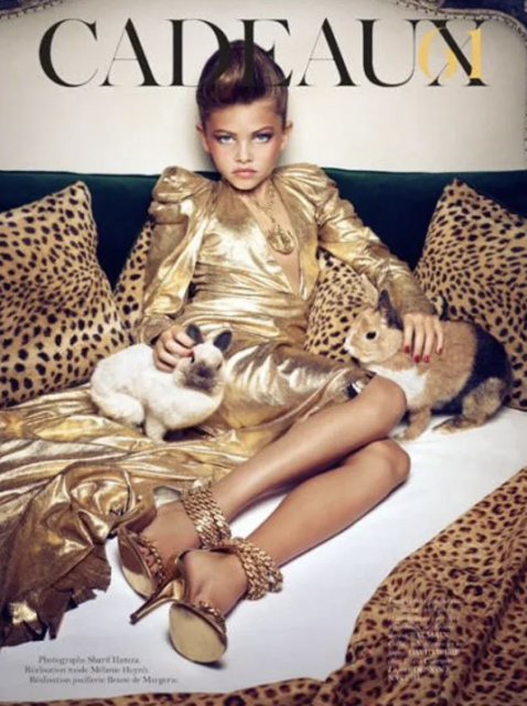 10歲那年登上法國版《Vogue》的那組照片,曾引發巨大爭議——畫面中她穿著低胸金色禮服和高跟鞋,妝容成熟,被批評「過度性感化未成年人」。