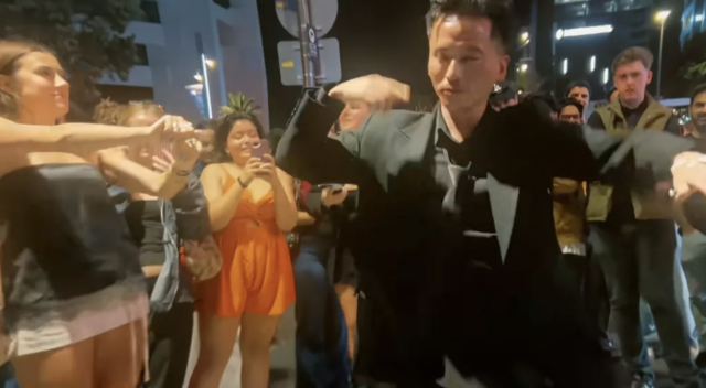 2月14日當晚11點多,華人博主鄭家興像往常一樣,在紐西蘭奧克蘭市中心碼頭一帶與街頭直播跳舞並與網友互動,氣氛輕鬆歡快。
