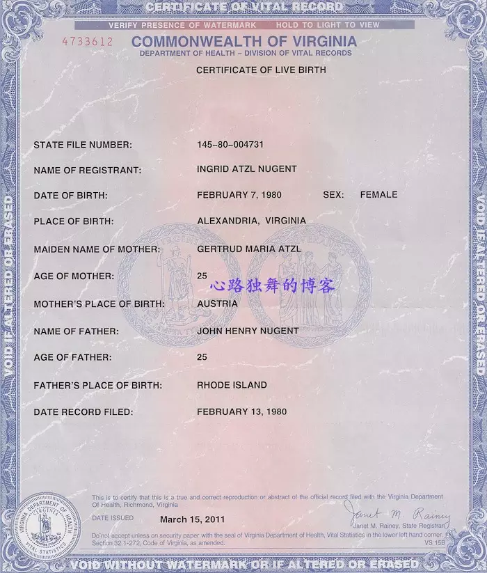 那麼美國戶口好辦嗎?事實是美國沒有戶口,美國人一生大約只需要三個證件。一是出生證明,上面列出了你在哪裡出生,父母是誰,父母的年齡和在哪裡出生。這個證明很重要,父母都會給孩子好好保存,因為在孩子成年之要前上學或辦護照等憑得就是這個證件,它能證明「你媽是你媽」、「你爸是你爸」、「你孩子是你孩子」和「你是美國人」等。這個證明辦起來很簡單,父母把孩子出生醫院給的出生記錄加上填好的申請表一起寄到所在州的健康服務部門就行,現在甚至還可以網上申請了,費用也不高,原件一旦丟失了的話父母或本人可以憑駕照或護照等有照片的證件申請重發,只是重發的出生證明底下會有簽字蓋章證明這是原件的複製件(certified copy)。這是弗吉尼亞出生證明的典型樣子。