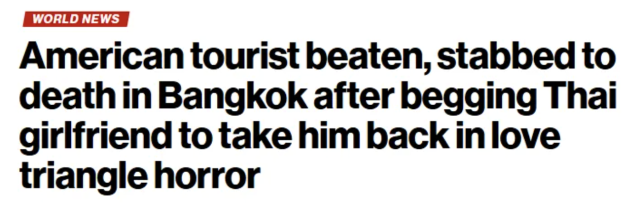 據報道,一名美國遊客在曼谷被四名男子毆打併刺死,當時他正苦苦哀求比他年輕很多的泰國前女友與他複合,這是一場血腥的三角戀衝突。