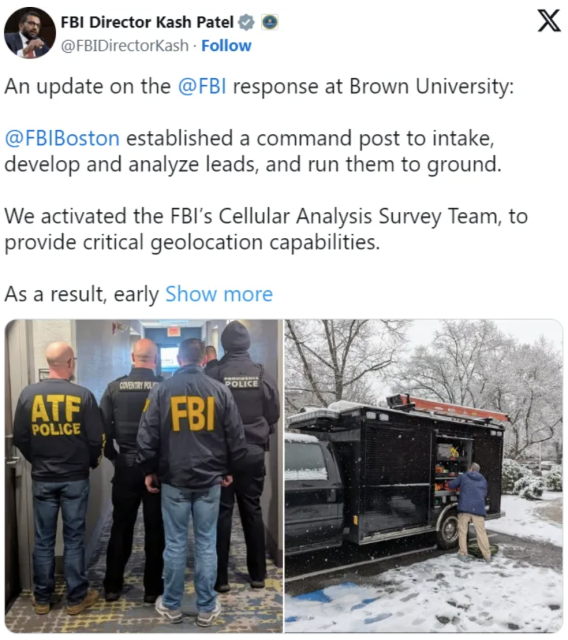 據CNN首席執法與情報分析師約翰·米勒(John Miller)援引執法部門消息稱,該名嫌犯並非羅德島州居民,也不是布朗大學學生,與該校不存在任何已知直接關聯。調查顯示,他從威斯康星州駕車前往羅德島州普羅維登斯,全程約17小時車程,途中跨越多個州界。