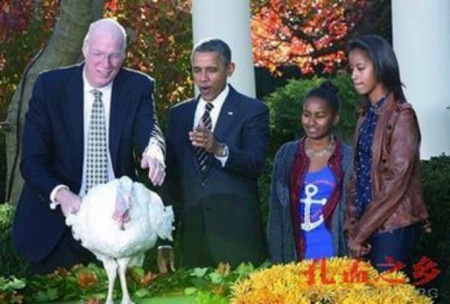奧巴馬說,我原本打算吃掉這隻火雞。由於薩莎和瑪麗亞的干預,我赦免了「勇氣」。這隻火雞將被送到迪士尼樂園。為防止意外,當局還準備了一隻備用火雞,名叫(卡羅琳娜)。