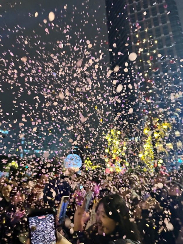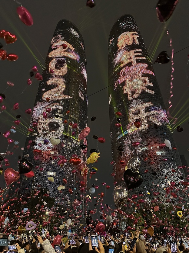 倒計時逼近,雙子塔化作巨大的流光畫布,霓虹躍動,節奏層層推高,彷彿整座城市的心跳在這一刻被調頻到同一個節拍。