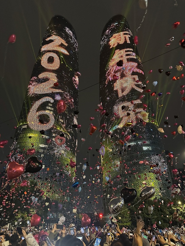 2026年的鐘聲直入雲霄,雙子塔華彩瞬間迸發。成千上萬隻承載心愿的氣球如星海倒流,緩緩升空。歡呼聲撕裂寒意,擁抱與笑臉被定格在每一個取景框里——那是年輕成都獨有的張力:熱烈、鮮活、充滿希望。