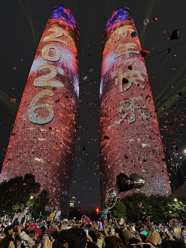夜幕垂落,整座城市的熱望向天府大道匯聚。交子大道上人潮如織,數萬道目光共同仰望天府國際金融中心雙子塔。南北雙塔並肩矗立,燈火漸次交織,在寒冬夜空中,靜靜醞釀著一場關於時間的告白。