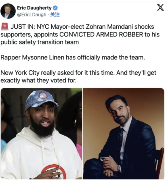 知名親特朗普媒體人埃里克·多爾蒂在X網站上發帖稱:「紐約市當選市長佐蘭·曼達尼任命一名曾因持械搶劫被定罪的罪犯進入其公共安全過渡團隊,此舉震驚了支持者。說唱歌手邁索恩·萊寧正式入選。紐約市這次真是咎由自取。他們將會得到他們投票選擇的結果。」