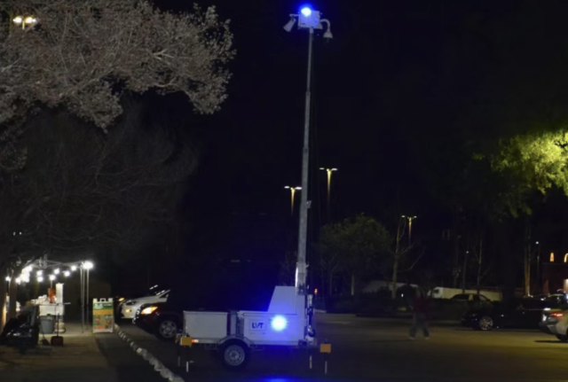 最近在美國各地,停車場、購物中心、建築工地和一些社區里,頻繁出現一種高高豎立的「移動監控拖車」(Cameras on Wheels,簡稱COWs)。它們外形醒目,帶有閃爍燈光和多組攝像頭,被不少人戲稱為「高科技稻草人」。