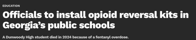 這不是聳人聽聞,而是喬治亞州官方在本周五親自宣布的一項全州性政策,從現在起,喬治亞州所有公立學校從小學、初中到高中——都將配備能夠逆轉阿片類藥物中毒的急救包(Narcan Kit)。