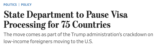 國務院發言人Tommy Pigott表示,此舉基於長期存在的「公共負擔」條款,領事官員將綜合評估申請人的健康、年齡、英語能力、財務狀況等因素,拒簽那些可能大量使用政府福利的人。受影響國家包括索馬利亞、俄羅斯、阿富汗、巴西、伊朗、伊拉克、埃及、奈及利亞、泰國、葉門等。