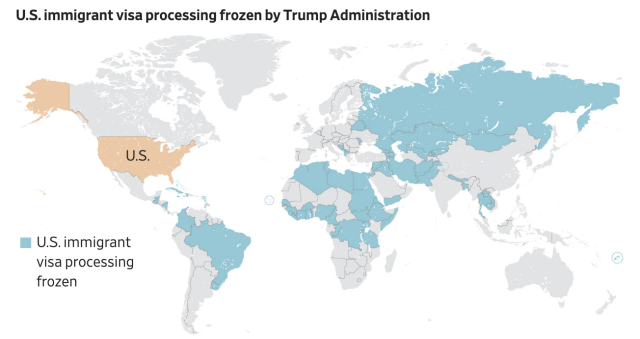 美國國務院1月14日宣布,從1月21日起無限期暫停來自75個國家的移民簽證(immigrant visa)處理。