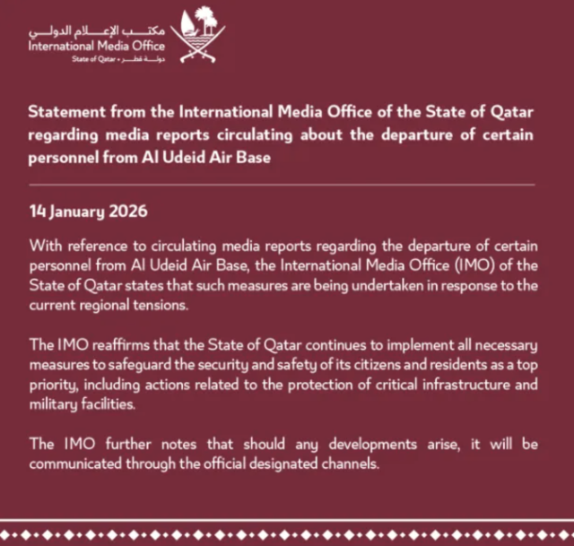 緊張氣氛,迅速從言辭蔓延到軍事層面。美國開始從中東最大空軍基地之一撤離人員,卡達國際媒體辦公室就有關「美軍官員被建議撤離卡達烏代德空軍基地」的報道作出回應稱,相關舉措是在當前地區局勢緊張的背景下採取的。英國同步跟進;美國駐伊朗「虛擬使館」連續發布警告,敦促本國公民立即離境。
