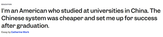 曾兩度赴中國留學的美國學生凱瑟琳·沃克(Catherine Work)表示,橫跨十年的兩段中國求學經歷,讓她深刻體會到中美高等教育體系在學費成本、校園文化及職業發展路徑上的巨大差異,也讓她重新審視美國大學的價值與不足。