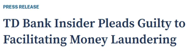 司法部披露:2019年至2021年期間 Aquino 利用銀行內部職權協助一個洗錢網路,並通過TD銀行賬戶轉移約4.74億美元現金。