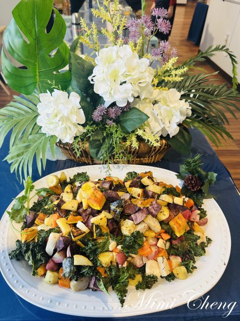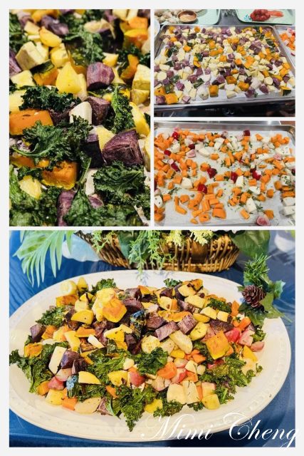 地瓜、胡蘿蔔、紫蘿蔔、防風草、南瓜、芹菜根在烤盤上綻放斑斕,迷迭香與鼠尾草的香氣,瀰漫整個廚房。