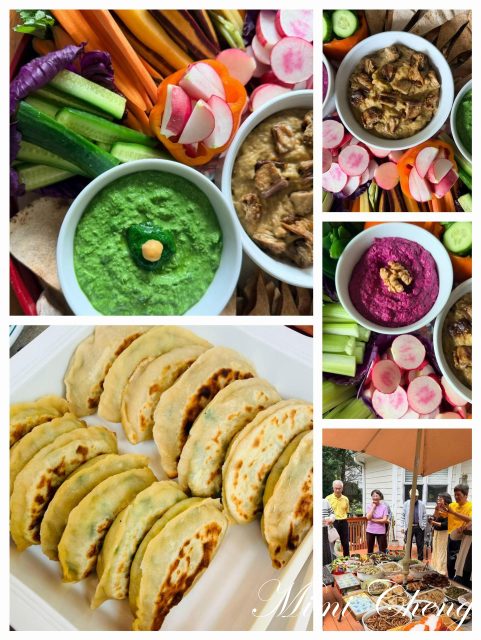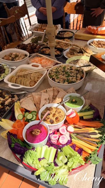 Nancy帶來的地中海風味拼盤最先吸引眼球:三碗鮮亮蘸醬——深紅的甜菜鷹嘴豆泥,絲滑甘甜,點綴碎核桃;煙熏茄子醬上鋪著烤茄子塊,帶著隱約的煙香;清新的綠色毛豆鷹嘴豆泥環繞著芹菜、黃瓜、彩色胡蘿蔔和荷蘭豆,彷彿一座微型春日花園。微微烤脆的黎巴嫩皮塔餅與蔬菜交織在舌尖上,酥香與清爽相互映襯。