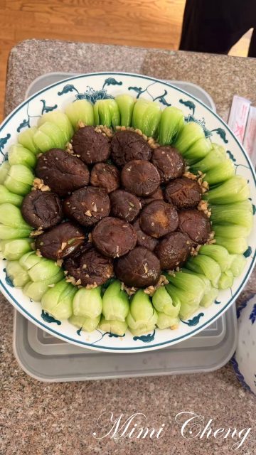 侯亞新的「春漫黛嵐」,香菇與菜心交錯,如山嵐間點點春意,清淡鮮美,轉瞬便被夾光。