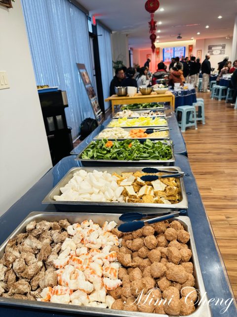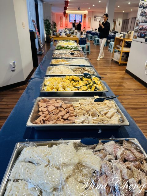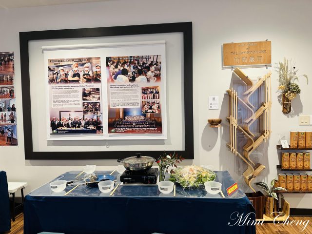 正午時分,會所早已洋溢著節慶般的暖意。紅燈籠在寒風中顯得格外溫柔,宛如提前點亮的新年心願。桌椅齊整雅潔,香積志工們忙碌穿梭,托盤中盛裝著各式鮮蔬、豆製品與菌菇等超過三十種食材,色彩鮮亮,香氣浮動,彷彿在輕聲訴說:「這是屬於我們的家宴。」